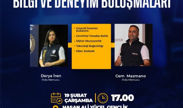 Hasan Ali Yücel Gençlik Bilim ve Sanat Merkezinde iki haftada bir düzenlenen bilgi ve deneyim buluşmaları, zengin içeriğiyle vatandaşları ağırlıyor. Alanında uzman isimlerin söz aldığı organizasyonda bu kez, dijital dünya masaya yatırılacak. Samsun İl Emniyet Müdürlüğü Siber Suçlarla Mücadele Şube Müdürlüğünde görevli polis memurları Derya İren ve Cem Mazmano 'Güvenli İnternet Kullanımı', 'Çevrim İçi Yasa Dışı Bahis', 'Teknoloji Bağımlılığı' ve 'Siber Zorbalık' başlıkları altında önemli bilgiler verecek. Program, 19 Şubat Çarşamba günü saat 17.00'de vatandaşlarla buluşacak.