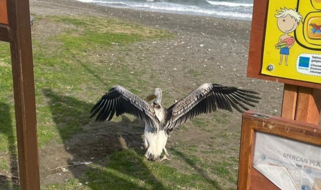Atakum sahilinde görülen pelikan, bir süre sahilde kaldıktan sonra gözden kayboldu.