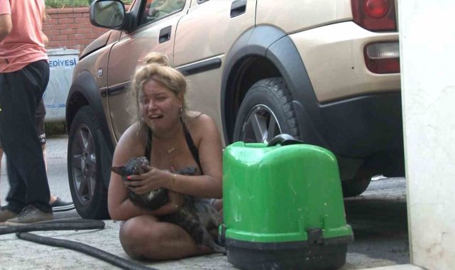 Edinilen bilgiye göre yangın, 19 Mayıs Caddesi üzerinde bulunan 5 katlı binanın 2'nci katında henüz bilinmeyen bir nedenle çıktı. Kısa sürede daireyi saran alevler nedeniyle olay yerine çok sayıda itfaiye, sağlık ve polis ekibi sevk edildi. İtfaiye ekipleri, yoğun duman nedeniyle mahsur kalan kadını kurtardı. Ekipler, kadının evde bulunan hayvanlarını da çıkarmak için çalışma yaptı. Köpek sağ olarak dışarı çıkarılırken, kedilerden biri ölü bulundu. Bu durumu gören ev sahibi kadın, olay yerinde sinir krizi geçirdi. Sağlık ekiplerinin tedavi teklifini reddeden kadın, gözyaşları içinde kurtarılan köpeğine sarıldı.
