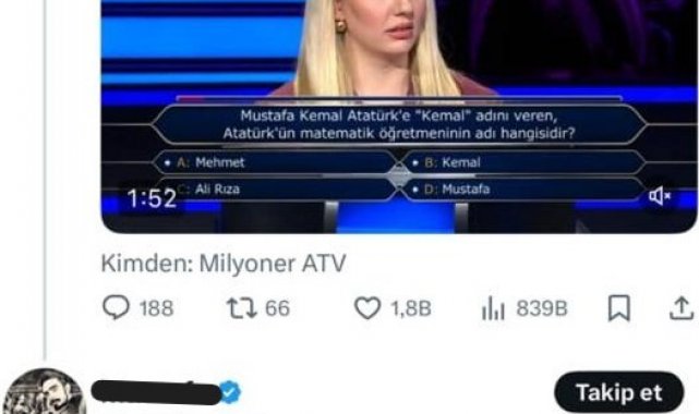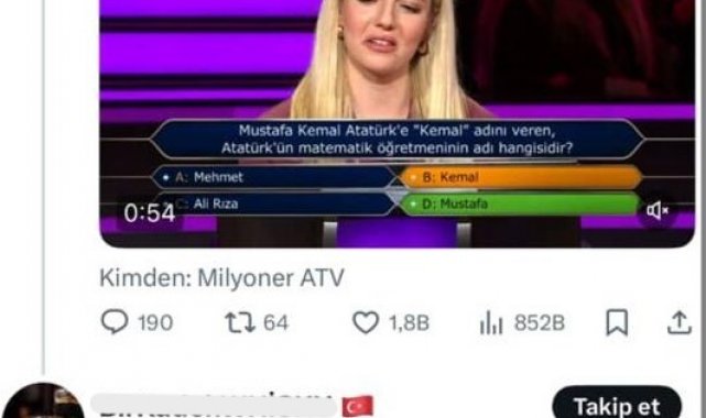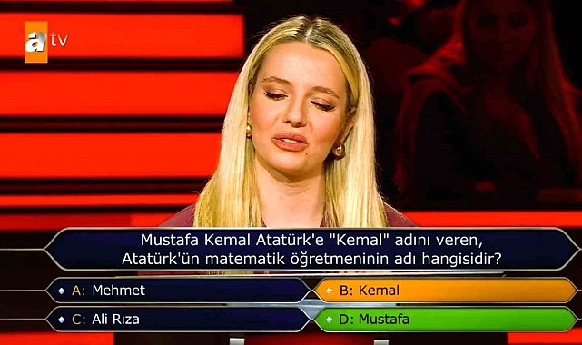 Özel bir televizyon kanalında yayınlanan Kim Milyoner Olmak İster adlı yarışma programına katılan ve elenmesine neden olan 5. soruda hatırlayamadığı Atatürk'ün ikinci ismiyle gündeme oturan genç kadın, "Programdan sonra linç edildim. Kimse Atatürk'e olan sevgimi ve saygımı sorgulayamaz" dedi.