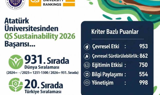 Atatürk Üniversitesi; çevresel, yönetişimsel ve toplumsal sürdürülebilirlik performanslarını değerlendiren QS Sustainability 2026 sonuçlarında dikkat çeken bir yükseliş kaydederek uluslararası alanda konumunu güçlendirdi. Bu doğrultuda ilk kez 2025 yılında QS (Quacquarelli Symonds) sıralamasına giren Atatürk Üniversitesi, 2026 sıralamasında da önemli bir başarı gösterdi.