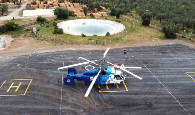 Yangın sezonunun başlamasıyla birlikte alınan önlemler kapsamında Edremit'in Zeytinli Mahallesinde bulunan heliportta konuşlandırılan KA 32T tipi helikopter dikkat çekiyor.