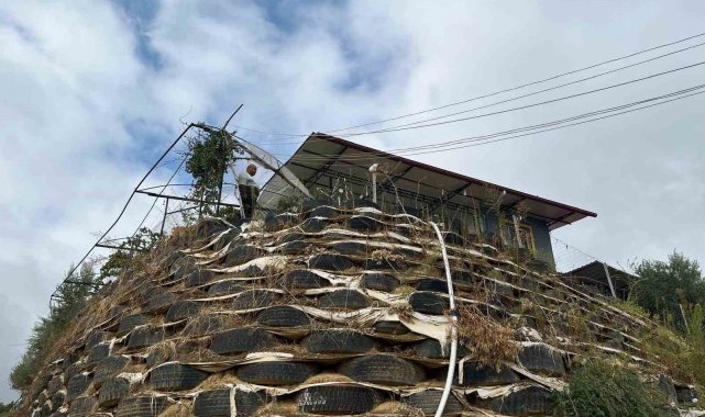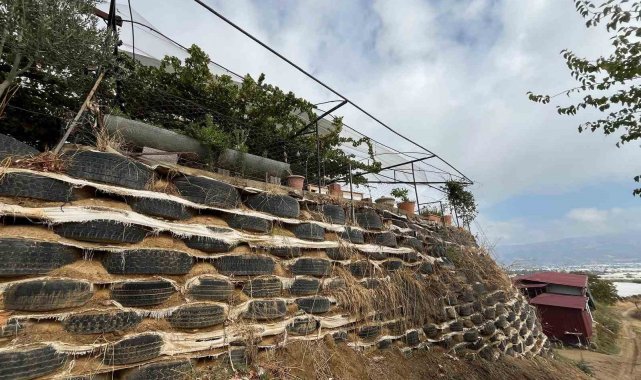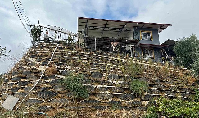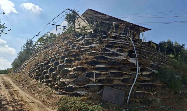 Sarıgöl ilçesi Emcelli Mahallesi'nde yaşayan çiftçi Ahmet Tosun, 7 yıl önce bağ evinin önünde olabilecek bir toprak kaymasını önlemek için farklı bir yöntem geliştirdi. Beton set duvar yerine maliyeti daha az olan üç tır dolusu ömrünü tamamlamış traktör ve kamyon lastiğiyle kale gibi bir duvar ören Tosun, hem evini korudu hem de geri dönüşüme örnek oldu.