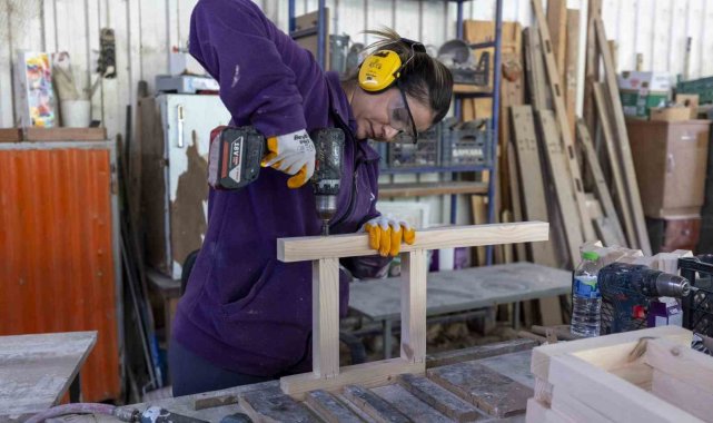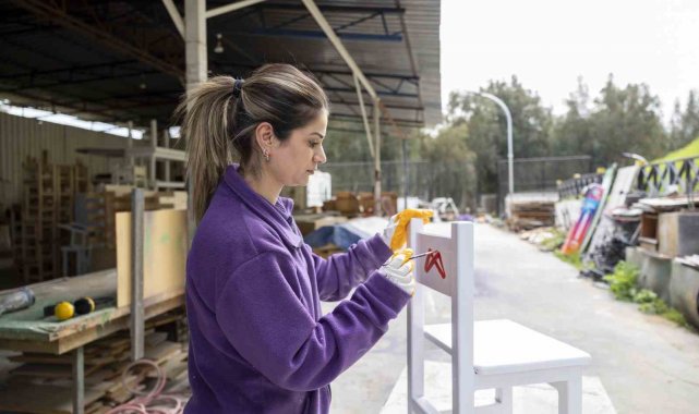 Mersin'nde Geri Dönüşüm Atölyesi'ne getirilen kullanım dışı malzemeler kadın marangoz 'Teslime Usta'nın emeğiyle çocuklar için masa, sandalye ve oyun parkurlarındaki mobilyalara dönüştürülerek tekrar kullanıma kazandırılıyor.