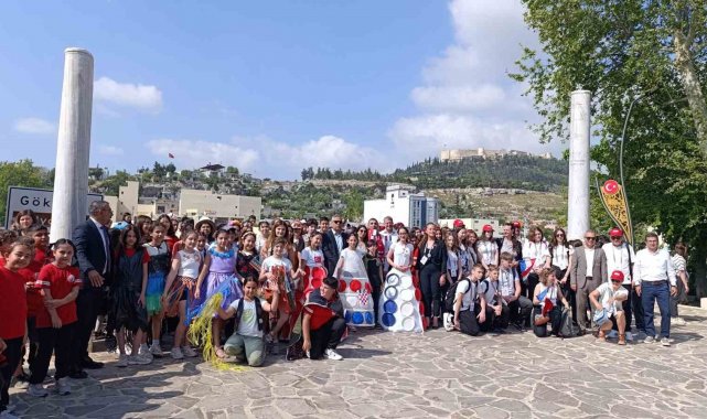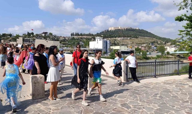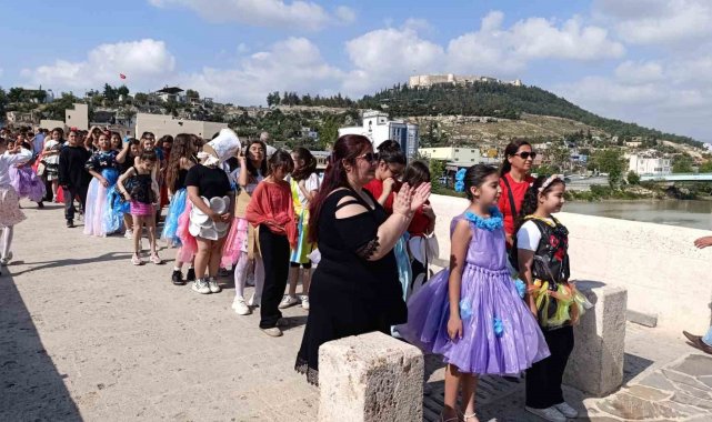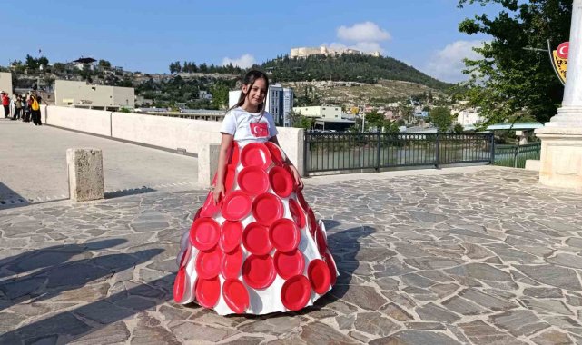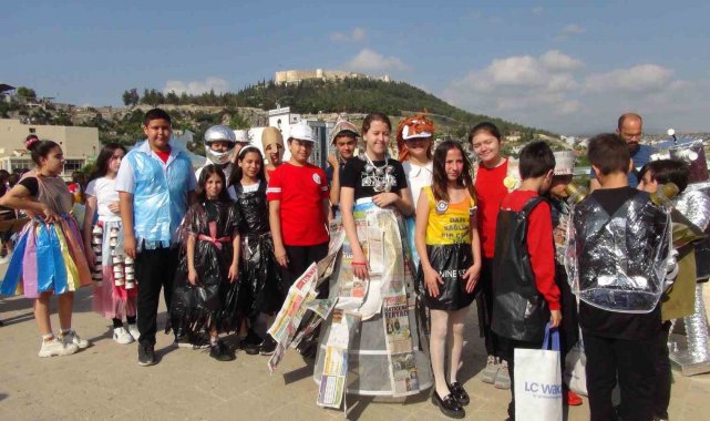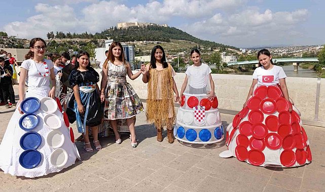 Mersin'in Silifke ilçesinde aralarında Fransız ve Hırvatların da olduğu öğrenciler, çevre kirliliği ve geri dönüşüme dikkat çekmek amacıyla atıklardan tasarlanan kıyafetlerle tarihi köprüde defile düzenledi.