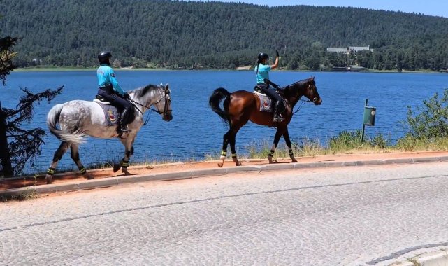 Bolu'nun önemli turizm merkezlerinden Abant Gölü Milli Parkı'nda görev yapan atlı jandarma timleri, yerli ve yabancı ziyaretçilerin güvenliğini sağlarken, vatandaşların da yoğun ilgisiyle karşılaşıyor.