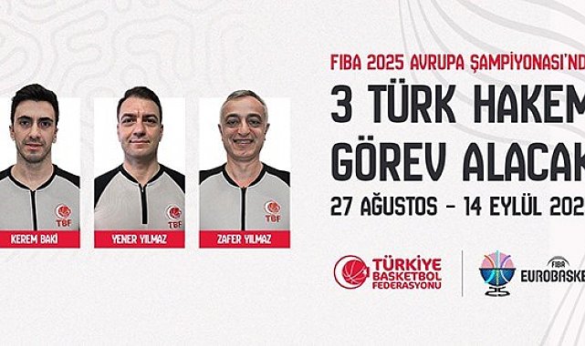 Finlandiya, Polonya, Kıbrıs Rum Kesimi ve Letonya'nın ev sahipliğinde 27 Ağustos - 14 Eylül tarihleri arasında düzenlenecek olan Uluslararası Basketbol Federasyonu (FIBA) 2025 Avrupa Basketbol Şampiyonası'nda (EuroBasket), 3 Türk hakeme görev verildi. Şampiyonada Kerem Baki, Yener Yılmaz ve Zafer Yılmaz görev yapacak. Ayrıca turnuvada Murat Biricik'in de FIBA hakem eğitmeni olarak görev alacağı belirtildi.