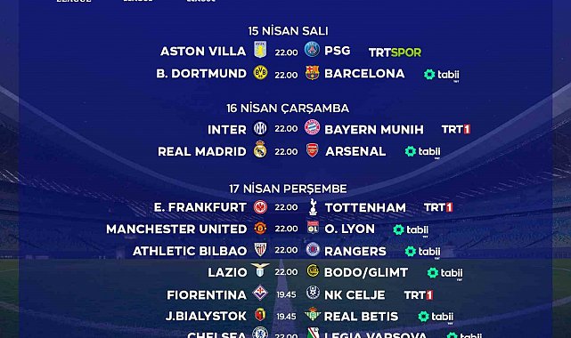 UEFA Şampiyonlar Ligi, Avrupa Ligi ve Konferans Ligi çeyrek final rövanş turunda, 15-17 Nisan tarihlerinde oynanacak 12 karşılaşma, TRT 1, TRT Spor ve tabii platformunda futbolseverlerle buluşacak.