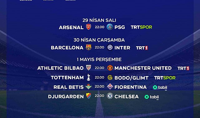 UEFA Şampiyonlar Ligi, Avrupa Ligi ve Konferans Ligi'nde yarı final kapsamında 29 Nisan-1 Mayıs tarihlerinde oynanacak 6 karşılaşma, TRT 1, TRT Spor ve tabii platformunda futbolseverlerle buluşacak.
