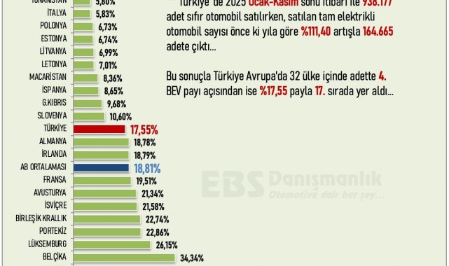 Kasım ayı satışlarında ise Türkiye, 17 bin 892 adet elektrikli otomobil satışı ile Avrupa 5. sırada yer aldı. Kasım ayındaki yıllık artış oranı yüzde 37,95 olarak kaydedildi. Elektrikli otomobillerin toplam otomobil satışları içindeki payına bakıldığında Türkiye'de Ocak-Kasım döneminde pazar payı yüzde 17,55 olarak tespit edildi. Bu oranla Türkiye, Avrupa'daki 32 ülke arasında 17. sırada konumlandı. Avrupa ortalaması ise yüzde 18,81 seviyesinde gerçekleşti. Türkiye'de 2026 yılında elektrikli araç tercihinin yüzde 20'lerin üzerine çıkması bekleniyor.