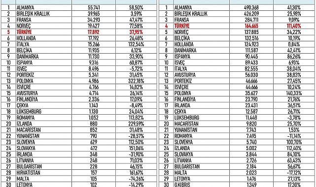 Raporda Almanya, Birleşik Krallık ve Fransa toplam satışlarda ilk üç sırayı alırken, Türkiye'nin toplam adet bazında bu ülkeleri takip ettiği belirtildi. Pazar payında ise Norveç, Danimarka ve İzlanda gibi ülkeler yüksek penetrasyon oranlarıyla listenin üst sıralarında yer aldı.