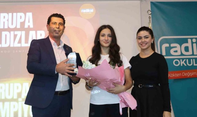 Yunanistan'da düzenlenen Avrupa Yıldızlar Taekwondo Şampiyonası'nda mücadele eden Radikal Konak Anadolu Lisesi öğrencisi Elif Esmira Özdirim, kızlar 59 kiloda tüm rakiplerini geride bırakarak Avrupa şampiyonu oldu. Genç sporcu, zorlu turnuvada çıktığı dört maçın tamamını kazanarak altın madalyaya uzandı. Genç şampiyona, öğrenim gördüğü Radikal Konak Anadolu Lisesi'nde ödül töreni düzenlendi. Törene, Radikal Eğitim Kurumları Genel Müdür Yardımcısı Ferhat Arslan, Radikal Konak Anadolu Lisesi Müdürü Mutlu Kara, Müdür Yardımcısı Müge Çakır, Radikal Eğitim Kurumları Kurumsal İletişim Müdürü Şive Karataş ve Rehberlik ve ARGE Koordinatörü Şule Baş katılırken öğrenci arkadaşları Elif Esmira Özdirim'i alkışlarla tebrik etti. Hem okuluna hem de ülkeye gurur yaşatan Elif Esmira Özdirim'e, Radikal Eğitim Kurumları Genel Müdür Yardımcısı Ferhat Arslan, Radikal Konak Anadolu Lisesi Müdürü Mutlu Kara plaket ve çiçek takdim etti.