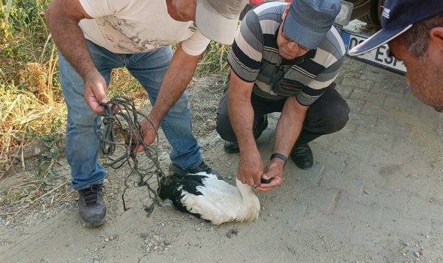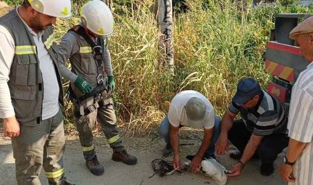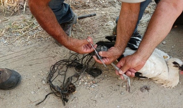 Ayağına ip dolanan leyleği vatandaşların dikkati kurtardı