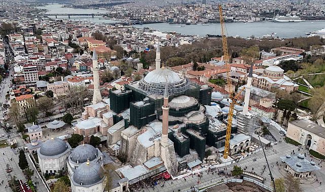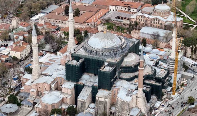 Havadan çekilen son görüntülerde, kubbe çevresinde kurulan geniş çelik platformlar, vinç sistemleri ve yoğun iskele ağı dikkat çekiyor. Yapının üst kısmını çevreleyen bu sistemler, geçici çatı uygulamasının sahada aktif şekilde sürdüğünü ortaya koyarken, kubbenin tamamen kapatılmasına yönelik hazırlıkların son aşamaya geldiğini gösteriyor. Uzmanlara göre bu yöntem, hem restorasyonun güvenli şekilde yapılmasını sağlıyor hem de Ayasofya'nın iç mekanındaki tarihi dokunun korunmasına katkı sunuyor.