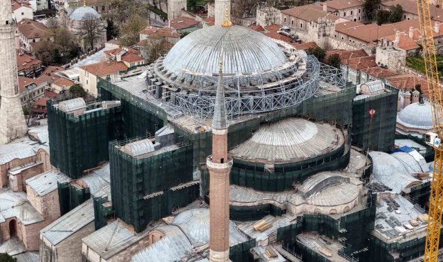 İstanbul'un simge yapılarından Ayasofya-i Kebir Camii'nde yürütülen Cumhuriyet tarihinin en kapsamlı restorasyon çalışmalarında kritik bir aşamaya geçildi. Devam eden çalışmalarda ana kubbenin korunması amacıyla geçici çelik konstrüksiyonla kapatılmaya başlandığı havadan çekilen görüntülere yansıdı.
