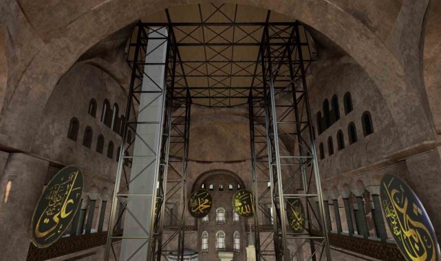 1486 yıllık Ayasofya-i Kebir Camii Şerifi'nde bir süredir devam eden restorasyon ve güçlendirme çalışmalarının bir kısmı tamamlandı. Ayasofya-i Kebir Camii Şerifi'nin ana kubbesinde ise tarihinin en kapsamlı güçlendirme ve restorasyon süreci başladı. Vakıflar Genel Müdürlüğü tarafından yürütülen çalışmalar, bilim adamları ve uzman restoratörlerin eşliğinde sürdürülürken, ana kubbede yürütülen restorasyon kapsamında, güçlendirme işlemleri başlatıldı. Kubbenin depreme karşı daha dayanıklı hale getirileceği, yapının özgün halinin titizlikle korunacağı ifade edildi. Kubbenin iç yüzeyindeki mozaiklere zarar gelmemesi için çalışmaların dış yüzeyden yürütüleceği, kurşun kaplamaların sökülerek onarılacağı veya yenileneceği kaydedildi. Hava şartlarından etkilenmemesi ve mozaiklerin korunması amacıyla kubbenin geçici olarak çelik konstrüksiyon ve özel branda ile kapatılacağı, ibadet ve restorasyon çalışmalarının eş zamanlı devam etmesi için 43,5 metre yüksekliğinde 4 ana kolon üzerine çelik platform kurulacağı belirtildi. Ayasofya-i Kebir Camii Şerifi'nin restorasyon süreci boyunca ibadete ve ziyarete açık olmaya devam edeceği öğrenildi. Öte yandan ana kubbesinde tarihi restorasyon başlatılan Ayasofya-i Kebir Camii Şerifi havadan görüntülendi.
