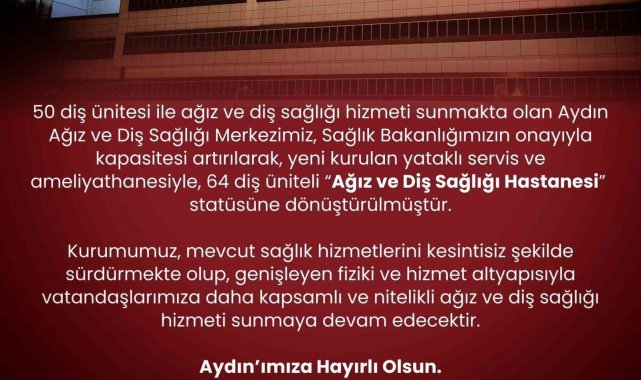 Aydın'da 50 diş ünitesi ile hizmet veren Aydın Ağız ve Diş Sağlığı Merkezi, Sağlık Bakanlığı'nın onayıyla kapasitesi artırılarak 'Ağız ve Diş Sağlığı Hastanesi' statüsüne dönüştürüldü.