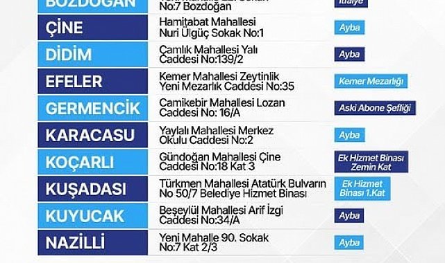 Aydın Büyükşehir Belediyesi'nden yapılan açıklamada, "Ocak 2026 Perşembe gününden itibaren 10 ilçemizde defin hizmetleri Büyükşehir Belediyemiz tarafından verilecektir. Defin Hizmet Ofislerimizden ve 444 40 09 ile 188 telefon numaralarımızdan bize ulaşabilirsiniz" denildi.