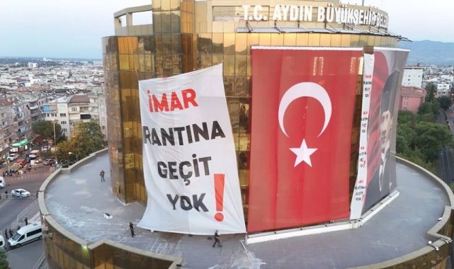 Cumhuriyet Halk Partisi (CHP) Genel Başkanı Özgür Özel'in partisinden istifa ederek AK Parti'ye geçen Özlem Çerçioğlu'na tepki göstermek amacıyla Aydın'da düzenlediği miting öncesi Aydın Büyükşehir Belediyesi binasına "İmar rantına geçit yok" yazılı dev bir pankart asıldı.