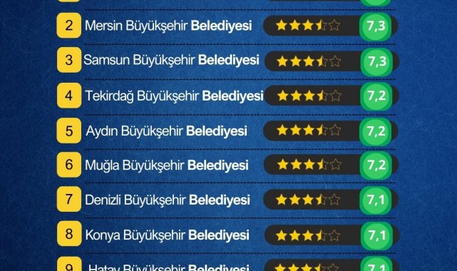 Araştırma, belediyelerin dijital platformlardaki olumlu, olumsuz ve nötr yorumlarının dengesi esas alınarak hazırlandı. Çalışmaya göre listenin ilk sırasında Gaziantep Büyükşehir Belediyesi yer alırken, Mersin Büyükşehir Belediyesi ve Samsun Büyükşehir Belediyesi onu takip etti. Aydın'ın ilk 5 içinde yer alması, kentte yürütülen sosyal belediyecilik uygulamaları ve altyapı yatırımlarının vatandaş nezdindeki karşılığını bir kez daha ortaya koydu.