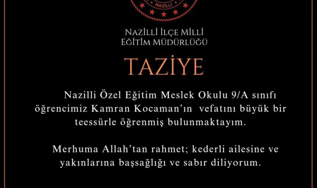 Nazilli İlçe Milli Eğitim Müdürü Erdinç Güner sosyal medya hesabından yaptığı paylaşımda, "Nazilli Özel Eğitim Meslek Okulu 9-A sınıfı öğrencimiz Kamran Kocaman'ın vefatını büyük bir üzüntüyle öğrenmiş bulunmaktayız. Merhuma Allah'tan rahmet, kederli ailesine ve yakınlarına başsağlığı ve sabır diliyoruz" ifadelerine yer vererek baş sağlığı dileklerini iletti.
