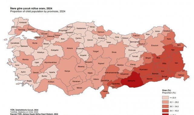 Çocuk nüfusunun toplam il nüfusu içindeki oranı illere göre incelendiğinde, en yüksek çocuk nüfus oranına sahip olan il, yüzde 43,8 ile Şanlıurfa oldu. Şanlıurfa'yı yüzde 39,8 ile Şırnak ve yüzde 37,4 ile Ağrı izledi. Çocuk nüfus oranının en düşük olduğu üç il ise sırasıyla yüzde 16,4 ile Tunceli, yüzde 17,3 ile Edirne ve yüzde 18 ile Kırklareli oldu. Yüzde 21,5 değeri ile Aydın, çocuk nüfus oranının en yüksek olduğu 55. il oldu.
