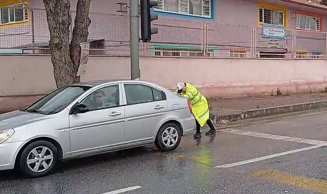 Aydın'ın Söke ilçesinde, yağışlı havada arızalanan bir aracın sürücüsüne polis ekipleri yardım etti. Polisler, arızalanan aracı güvenli bir alana itip trafik yoğunluğunun oluşmasını engelledi.