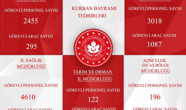 Aydın Valiliği'nden yapılan açıklamaya göre Kurban Bayramı boyunca; İl Emniyet Müdürlüğü, İl Jandarma Komutanlığı, İl Sağlık Müdürlüğü, Tarım ve Orman İl Müdürlüğü ve ADM Elektrik ekiplerinden oluşan toplamda 10 bin 401 görevli personel, bin 532 araçla sahada olacak. Bayram boyunca güvenliği sağlamak amacıyla İl Emniyet Müdürlüğü 295 araç ve 2 bin 455 personel ile görev yapacak. İl Jandarma Komutanlığı ise bin 87 araç ve 3 bin 18 personel ile vatandaşların güvenliğini sağlayacak. Acil sağlık hizmetlerinin kesintisiz devam edebilmesi için İl Sağlık Müdürlüğü 65 araç ve 4 bin 610 personel ile hazır bulunacak. Ayrıca, Ramazan Bayramı'nın en önemli unsurlarından biri olan gıda güvenliği için Tarım ve Orman İl Müdürlüğü 33 araç ve 122 personel ile sahada olacak. Bayram boyunca enerji hizmetlerinde aksama yaşanmaması adına ADM Elektrik de 52 araç ve 196 personel ile görev yapacak.