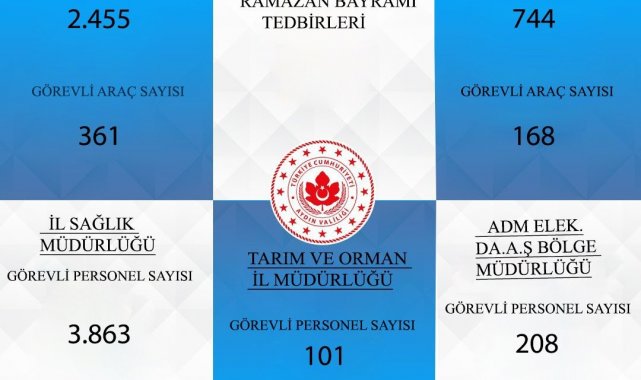 Aydın Valiliği'nden yapılan açıklamaya göre Ramazan Bayramı boyunca; İl Emniyet Müdürlüğü, İl Jandarma Komutanlığı, İl Sağlık Müdürlüğü, Tarım ve Orman İl Müdürlüğü ve ADM Elektrik ekiplerinden oluşan toplamda 7 bin 371 görevli personel, 694 araçla sahada olacak. Bayram boyunca güvenliği sağlamak amacıyla İl Emniyet Müdürlüğü 361 araç ve 2 bin 455 personel ile görev yapacak. İl Jandarma Komutanlığı ise 168 araç ve 744 personel ile vatandaşların güvenliğini sağlayacak. Acil sağlık hizmetlerinin kesintisiz devam edebilmesi için İl Sağlık Müdürlüğü 92 araç ve 3 bin 863 personel ile hazır bulunacak. Ayrıca, Ramazan Bayramı'nın en önemli unsurlarından biri olan gıda güvenliği için Tarım ve Orman İl Müdürlüğü 28 araç ve 101 personel ile sahada olacak. Bayram boyunca enerji hizmetlerinde aksama yaşanmaması adına ADM Elektrik de 45 araç ve 208 personel ile görev yapacak.