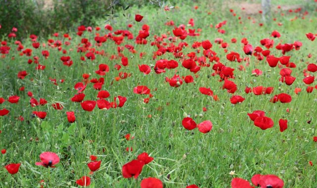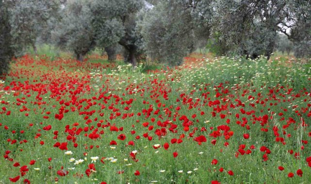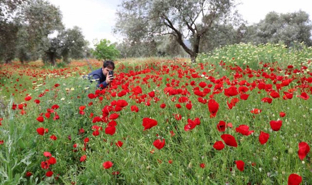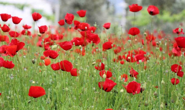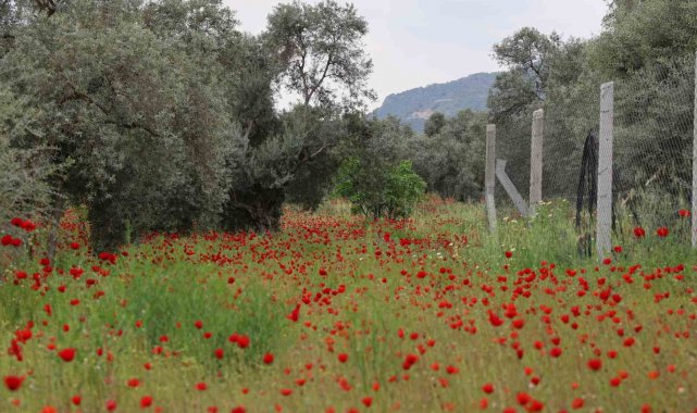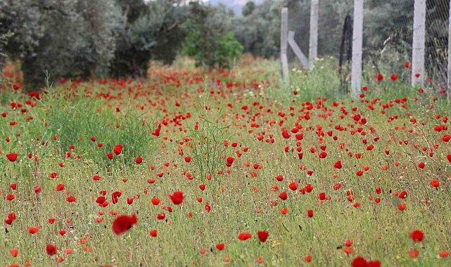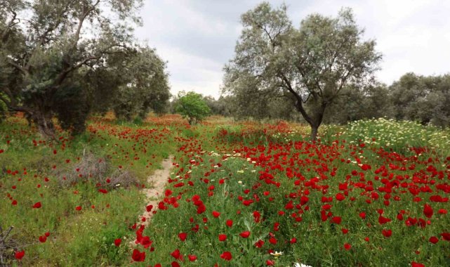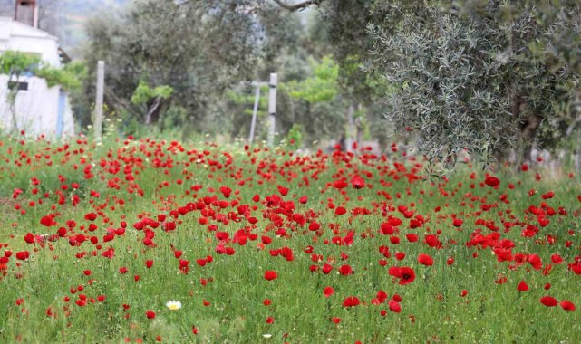 Aydın'ın Efeler ilçesinde etkili olan yağışların ardından açan gelincik çiçekleri, bahçe ve tarlaları kırmızıya boyadı. Özellikle Kızılcaköy Mahallesi'ndeki zeytin bahçeleri, gelinciklerin açmasıyla adeta kartpostallık manzaralara sahne oldu.
