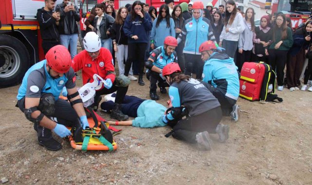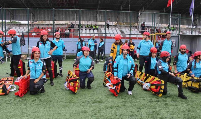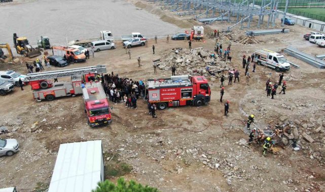 Aydın Valiliği koordinesinde gerçekleştirilen helikopter destekli saha tatbikatında, ekipler senaryo gereği tribün çökmesi sonucu 202 kişinin yaralandığı, 5 kişinin hayatını kaybettiği olaya müdahale etti.
