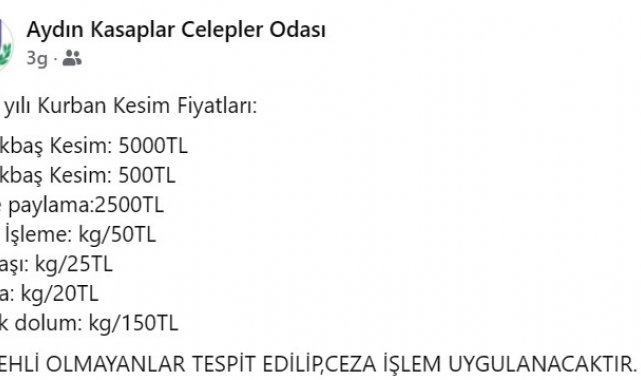 Kurban Bayramı öncesinde Aydın Kasaplar ve Celepler Odası tarafından belirlenen 2025 yılı kurban kesim ücretleri sosyal medya hesabı üzerinden kamuoyuyla paylaşıldı. Açıklanan tarifeye göre; büyükbaş kesim ücreti 5 bin TL, küçükbaş kesim ücreti 500 TL, hisse paylama 2 bin 500 TL, kuzu işleme (kg) 50 TL, kuşbaşı doğrama (kg) 25 TL, kıyma çekme (kg) 20 TL ve sucuk dolum (kg) 150 TL olarak belirlendi. Yetkililer, vatandaşların kurban kesimlerini belgeli, ehliyetli ve hijyen kurallarına uygun şekilde hizmet veren kasaplara yaptırmaları gerektiğini hatırlatarak, kurallara uymayan kişilerin tespit edilmesi halinde cezai işlem uygulanacağını açıkladı.