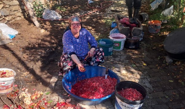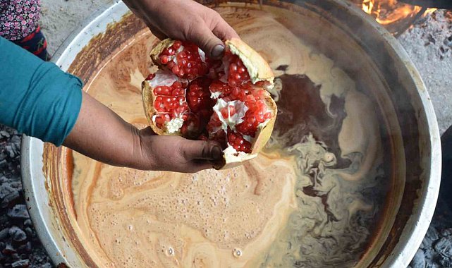 Aydın'ın Efeler ilçesi Dağeymiri Mahallesi'nde nar ekşisi üretimi, dededen kalma yöntemlerle sürdürülüyor. Vatandaşlardan Muharrem Ay ve ailesi, topladıkları narları tahta teknede ezip odun ateşinde kaynatarak geleneksel lezzeti yaşatıyor.