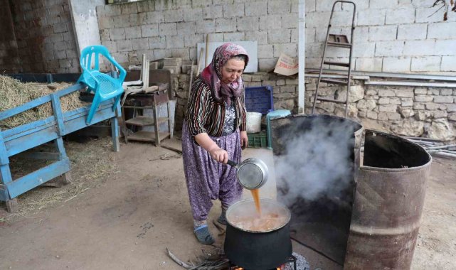 Dağeymiri Mahallesi'nde nar ekşisi yapımında geleneksel yöntemler yaşatılmaya devam ediyor. Mahalle sakinlerinden Muharrem Ay, ailesiyle birlikte her yıl olduğu gibi bu yıl da hasat ettikleri narları eski usul ile ekşiye dönüştürüyor. Hasadın ardından tanelerine ayrılan narlar, tahta teknelere alınarak eziliyor. Elde edilen nar suyu, daha sonra odun ateşinde saatlerce kaynatılarak kıvamlı bir ekşiye dönüşüyor. Tamamen doğal yöntemlerle yapılan nar ekşisi, zahmetli yapım sürecinin ardından pazar tezgahlarında yerini almaya başlarken, vatandaşların da doğal ve ev yapımı nar ekşisine ilgisi yoğun oluyor.