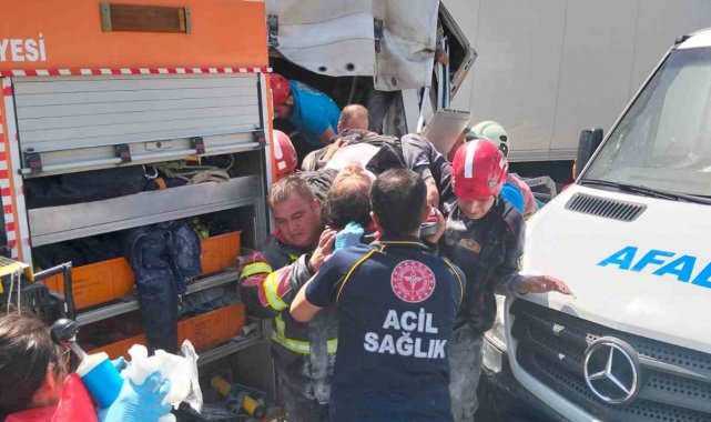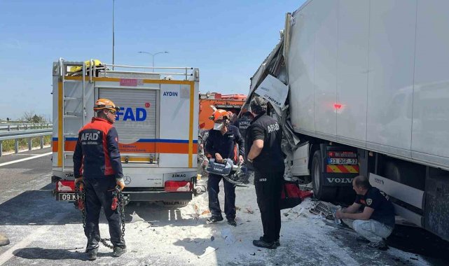 Kaza, Aydın-Denizli Otoyolu gişeleri yakınlarında meydana geldi. Edinilen bilgiye göre, henüz bilinmeyen bir nedenle U.G. idaresindeki 33 AIH 751 plakalı tır önünde ilerleyen S.U. yönetimindeki 35 RMZ 22 plakalı başka bir tıra arkadan çarptı. Çarpışmanın etkisi ile arkadaki tır şoförü U.G. araç kabini içerisinde sıkışarak yaralandı. Kazayı görenler durumu 112 Acil Çağrı Merkezi'ne bildirdi. İhbar üzerine bölgeye acil sağlık, polis, jandarma, itfaiye, UMKE ve AFAD ekipleri sevk edildi. Kısa sürede olay yerine gelen Aydın Büyükşehir Belediyesi İtfaiye Daire Başkanlığı ve AFAD ekipleri yaralı sürücü U.G.'yi sıkıştığı yerden çıkartarak sağlık ekiplerine teslim etti. Sağlık ekipleri tarafından da ilk müdahalesi yapılan tır sürücüsü ambulansla hastaneye kaldırdı.