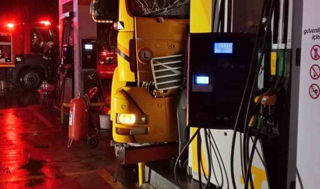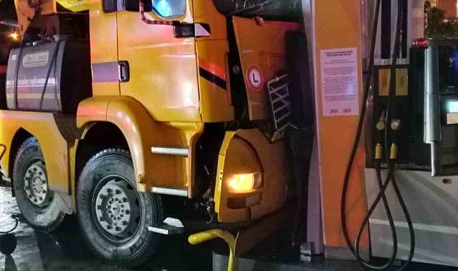 Aydın'ın Efeler ilçesinde, sürücüsünün direksiyon hakimiyetini kaybettiği bir vinç, akaryakıt istasyonundaki pompaya çarparak durdu.