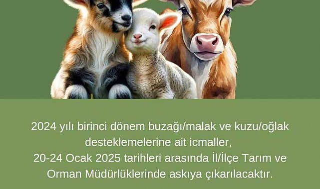 Konuyla ilgili Aydın İl Tarım ve Orman Müdürlüğü'nden yapılan açıklamada, "2024 yılı birinci dönem buzağı/malak ve kuzu/oğlak desteklemelerine ait icmaller 20 - 24 Ocak 2025 tarihleri arasında İl/İlçe Tarım ve Orman Müdürlüklerinde askıya çıkarılacaktır. Askı listelerinde, kendinize ait destekleme bilgilerini mutlaka kontrol ediniz ve varsa hataları düzelttirmeyi unutmayınız" ifadelerine yer verildi.