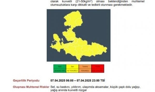 Meteoroloji 2. Bölge Müdürlüğü Bölge Tahmin ve Erken Uyarı Merkezi'nden yapılan "Aydın'da yerel kuvvetli yağışlara dikkat" başlıklı açıklamada "Yapılan son değerlendirmelere göre yarın sabah saatlerinden itibaren Aydın il genelinde (Buharkent, Kuyucak, Karacasu Bozdoğan hariç) görülecek gök gürültülü sağanak yağışların, yerel olarak kuvvetli (21-50kg/m2) olması beklendiğinden muhtemel olumsuzluklara karşı dikkatli ve tedbirli olunması gerekmektedir. Oluşması muhtemel sel, su baskını, yıldırım, ulaşımda aksamalar, küçük çaplı dolu yağışı, yağış anında kuvvetli rüzgar gibi risklere karşı dikkatli olunulmalıdır" ifadeleri yer aldı.