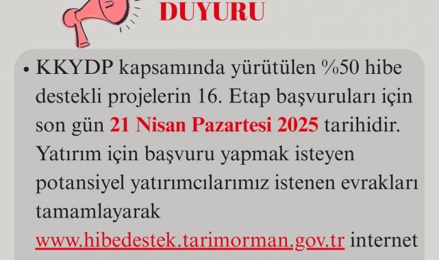 Aydın Tarım ve Orman İl Müdürlüğü'nden yapılan açıklamada, tarım ve kırsal kalkınmaya yönelik yatırım yapmak isteyen girişimcilerin gerekli evrakları eksiksiz şekilde hazırlayarak başvurularını www.hibedestek.tarimorman.gov.tr internet adresi üzerinden gerçekleştirebileceği belirterek başvuru için son günün 21 Nisan Pazartesi günü olduğu belirtildi. Müdürlükten yapılan açıklamda, "KKYDP kapsamında yürütülen yüzde 50 hibe destekli projelerin 16. Etap başvuruları için son gün 21 Nisan Pazartesi 2025 tarihidir. Yatırım için başvuru yapmak isteyen potansiyel yatırımcılarımız istenen evrakları tamamlayarak www.hibedestek.tarimorman.gov.tr internet adresinden başvurularını yapabilirler" ifadelerine yer verildi.