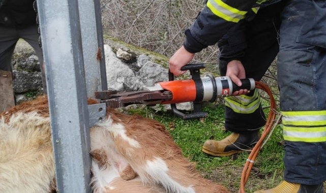 Aydınlatma direğine sıkışan buzağıyı itfaiye ekipleri kurtardı
