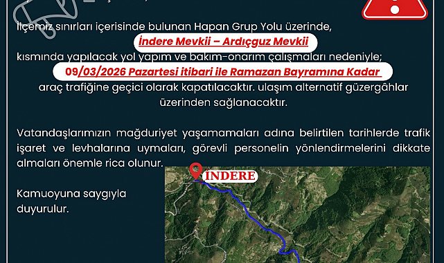 Ayvacık Kaymakamlığı'ndan yapılan açıklamada, Hapan grup yolu üzerindeki İndere mevkii ile Ardıçgüz mevkii arasında yürütülecek çalışmalar kapsamında yolun 9 Mart itibarıyla araç trafiğine geçici olarak kapatıldığı bildirildi. Ulaşımın bu süreçte alternatif güzergâhlar üzerinden sağlanacağı belirtildi.