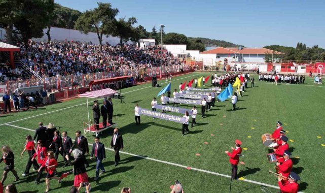 Yüzlerce Ayvalıklının ilgiyle izlediği stadyumdaki etkinlikler; Ayvalık Belediyesi bando takımının eşliğinde saygı duruşu, İstiklal Marşı'nın bir ağızdan okunmasıyla başladı.