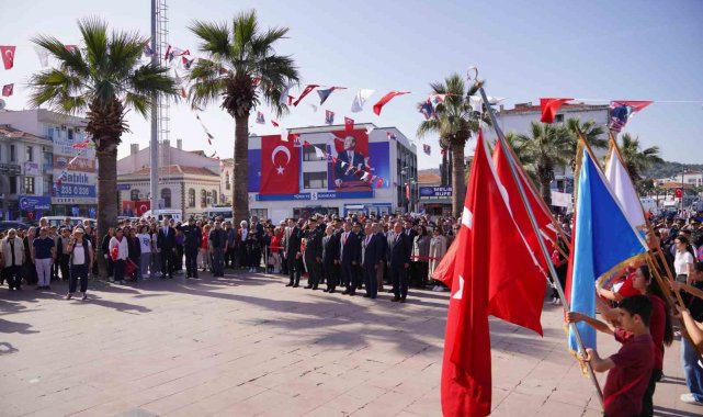 Ayvalık'ta saat 09.00'da ilçe merkezindeki Cumhuriyet Meydanı'nda Ayvalık Kaymakamı Hasan Yaman, Garnizon Komutanı Personel Albay Hüseyin Aydın, Ayvalık Belediye Başkanı Mesut Ergin, İlçe Milli Eğitim Müdürü Güner Bahadır, daire amirleri, siyasi partilerle sivil toplum kuruluşlarının temsilcileri, gaziler, şehit aileleri, öğretmenler, öğrenciler ve vatandaşların hazır bulunduğu çelenk sunma töreninin ardından etkinlikler, Hüsnü Uğural Stadyumu'nda sürdü.