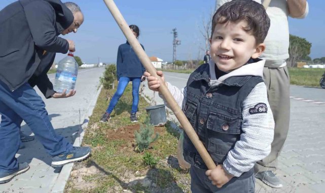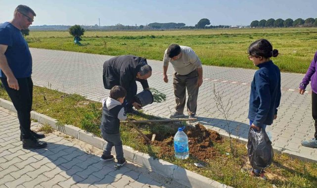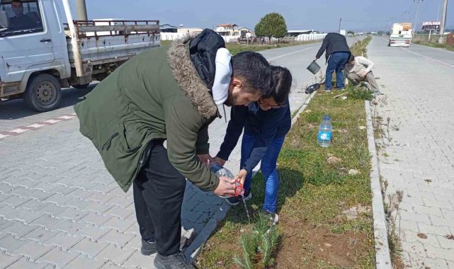 Ayvalık Belediyesi'nin de desteğiyle yapılan gönüllü çalışmalarda yaklaşık 150 adet çam fidanı yol üzerindeki refüjlerde toprakla buluşturuldu.