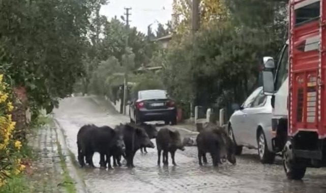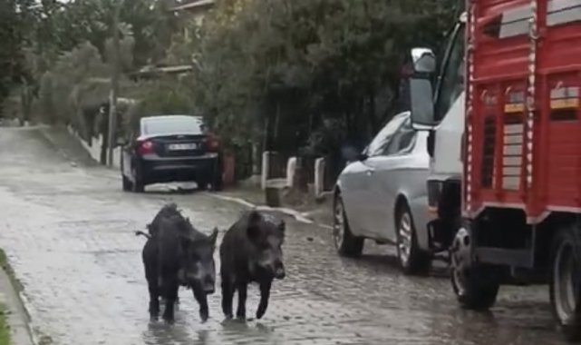 Ayvalık'ta yağmurlu havada aç kalan domuzlar şehir merkezine indi