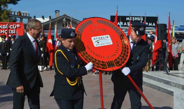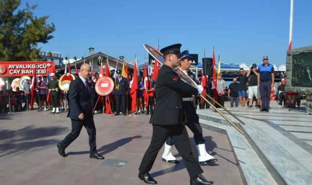 Sabah saat 10.00'da ilçe merkezindeki Cumhuriyet Meydanı'nda toplanan Kaymakam Hasan Yaman öncülüğündeki çelenk sunma töreninde; Ayvalık Belediye Başkanı Mesut Ergin, Garnizon Komutanı Personel Albay Hüseyin Aydın, Cumhuriyet Başsavcısı Mehmet Fatih Acemoğlu'nun yanı sıra; daire amirleri, şehit aileleri, gaziler, siyasi parti ve sivil toplum kuruluşlarının temsilcileriyle kalabalık bir vatandaş topluluğu hazır bulundu.