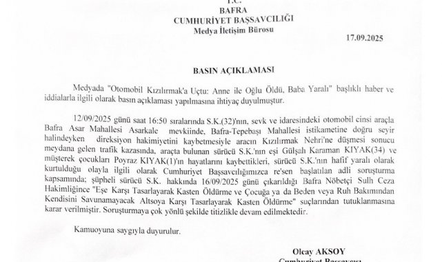Cumhuriyet Başsavcısı Olcay Aksoy imzalı açıklamada, "Medyada 'Otomobil Kızılırmak'a uçtu: Anne ile oğlu öldü, baba yaralı' başlıklı haber ve iddialarla ilgili olarak basın açıklaması yapılmasına ihtiyaç duyulmuştur. 12 Eylül 2025 günü saat 16.50 sıralarında S.K.'nin (32), sevk ve idaresindeki otomobil cinsi araçla Bafra Asar Mahallesi Asarkale mevkiinde, Bafra-Tepebaşı Mahallesi istikametine doğru seyir halindeyken direksiyon hakimiyetini kaybetmesiyle aracın Kızılırmak Nehri'ne düşmesi sonucu meydana gelen trafik kazasında, araçta bulunan sürücü S.K.'nin eşi Gülşah Karaman Kıyak (34) ve müşterek çocukları Poyraz'ın hayatlarını kaybettikleri, sürücü S.K.'nin hafif yaralı olarak kurtulduğu olayla ilgili olarak Cumhuriyet Başsavcılığımızca resen başlatılan adli soruşturma kapsamında; şüpheli sürücü S.K. hakkında 16 Eylül 2025 günü çıkarıldığı Bafra Nöbetçi Sulh Ceza Hakimliğince 'eşe karşı tasarlayarak kasten öldürme ve çocuğa ya da beden veya ruh bakımından kendisini savunamayacak altsoya karşı tasarlayarak kasten öldürme' suçlarından tutuklanmasına karar verilmiştir. Soruşturmaya çok yönlü şekilde titizlikle devam edilmektedir" denildi.