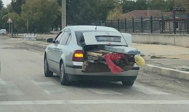 Alpu ilçesi Mihalıççık caddesi üzerinde seyreden sedan otomobilin bagajına yüklenen kereste ve inşaat malzemeleri dikkat çekti. Malzemelerin ağırlığından dolayı aracın arka bölümünde çökme yaşanırken, bagajdan dışarı taşan yük ise trafikteki diğer araçları tehlikeye attı. Otomobilin cadde üzerinde bu şekilde seyrettiği gözlemlendi.