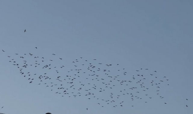 Baharın müjdecisi olarak bilinen sığırcık kuşları, Yüksekova semalarında adeta görsel şölen sundu.