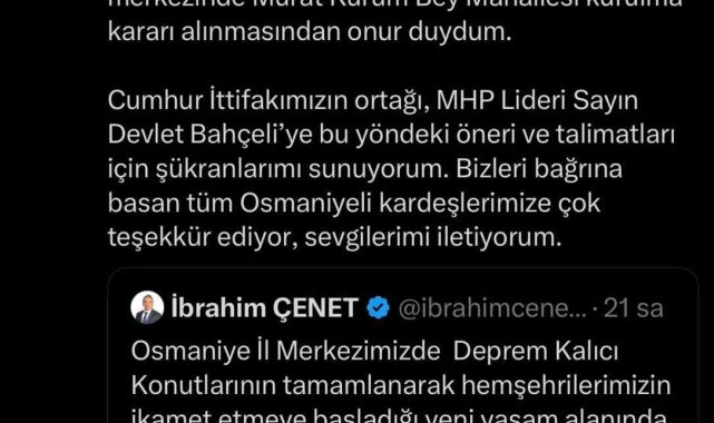 Çevre, Şehircilik ve İklim Değişikliği Bakanı Murat Kurum ise sosyal medya hesabından konuyla ilgili yaptığı açıklamada, "6 Şubat asrın felaketinde yara alan Osmaniye'mizi ayağa kaldırmak, Osmaniyeli hemşehrilerimizi yuvalarına kavuşturmak için çok çalıştık, çalışıyoruz. Bu çabanın Osmaniye'miz tarafından takdir gördüğünü, önce fahri hemşehrilik şimdi de il merkezinde Murat Kurum Bey Mahallesi kurulma kararı alınmasından onur duydum. Cumhur İttifakımızın ortağı, MHP lideri Sayın Devlet Bahçeli'ye bu yöndeki öneri ve talimatları için şükranlarımı sunuyorum. Bizleri bağrına basan tüm Osmaniyeli kardeşlerimize çok teşekkür ediyor, sevgilerimi iletiyorum."